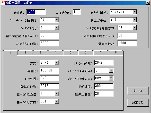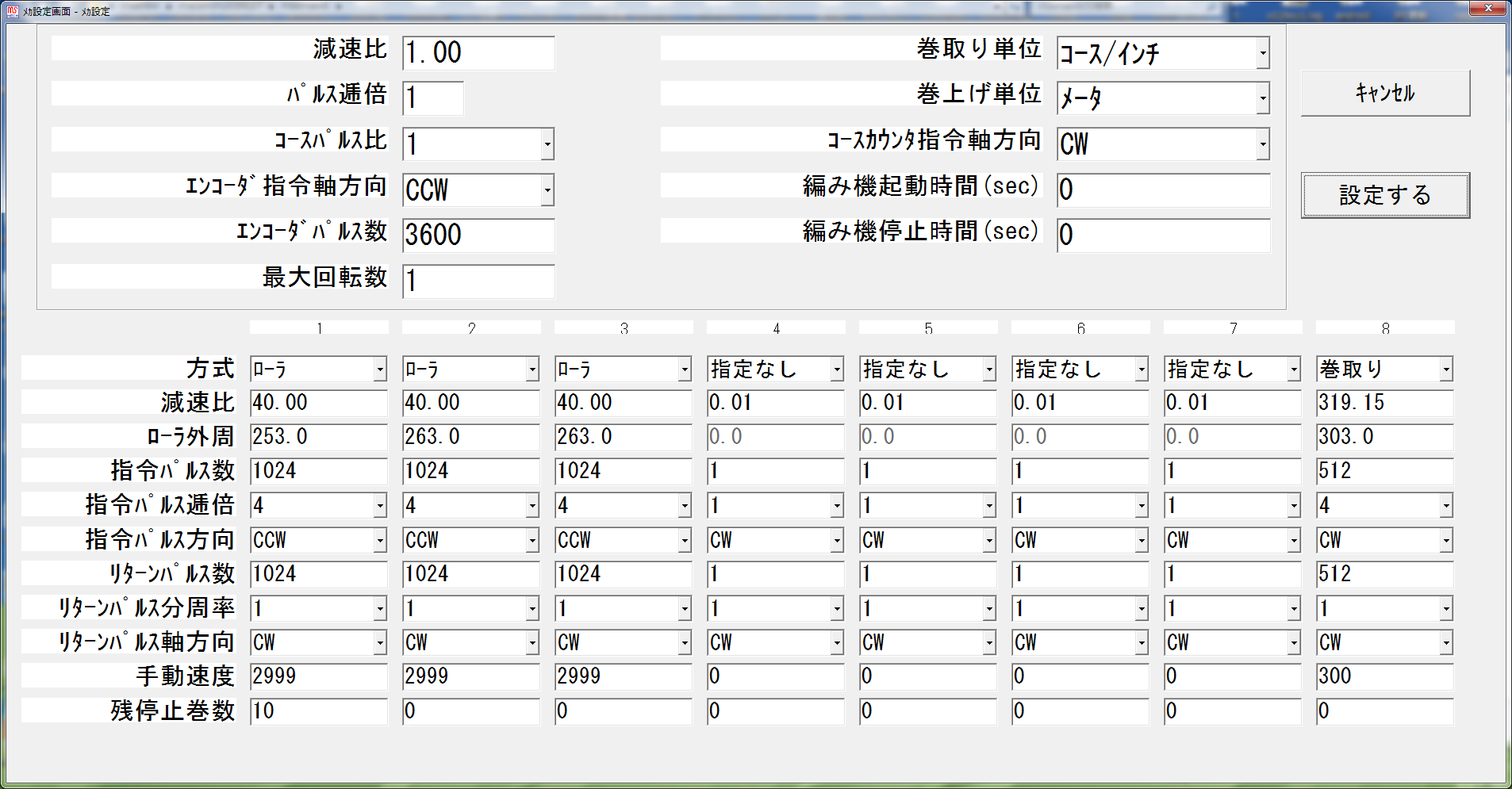 この画面で、軸の方式/不使用、減速比やローラー径、エンコーダパルス数等の入力/変更が出来ます。