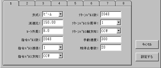 | サーボモータの軸とビーム/ローラ/巻き取り軸の減速比を入力します。