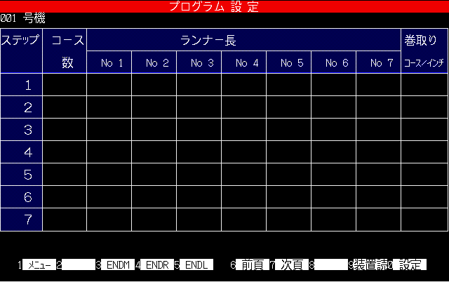 F1 メニューに戻ります。 F3 機械停止条件を編み上げメーターに設定します。 F4 機械停止条件をステップのリピート数に設定します。 F5 機械停止条件をラック数に設定します。 F6 ステップ数の前ページを表示します。 F7 ステップ数の次ページを表示します。 F9 設定条件を機械から読み出します。 F10 設定条件を機械に書き込みます。