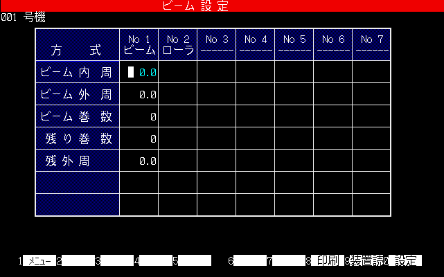 ビーム内周ビームの内周を入力します。 ビーム外周ビームの外周を入力します。。 ビーム巻数ビームの巻数を入力します。 残り巻数ビームの残り巻数を入力します。 残外周ビームの残り外周を入力します。 残り巻数を入力すると残外周が、残外周を入力すると残り巻数を内部で計算して代入します。
