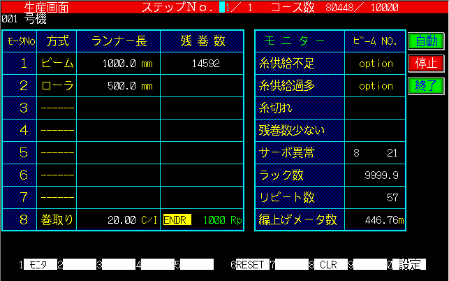 ステップ ステップ番号です。現在実行しているステップ数を変更できます。 コース数 現在のステップに対するコース数です。機械がこのステップ数に達したらステップが+1します。 残巻数 ビームの場合、現在の巻数残です。 ラック数 現在のラック数です。 リピート数 現在のリピート数です。 編み上げメータ長 現在の編み上げメータです。