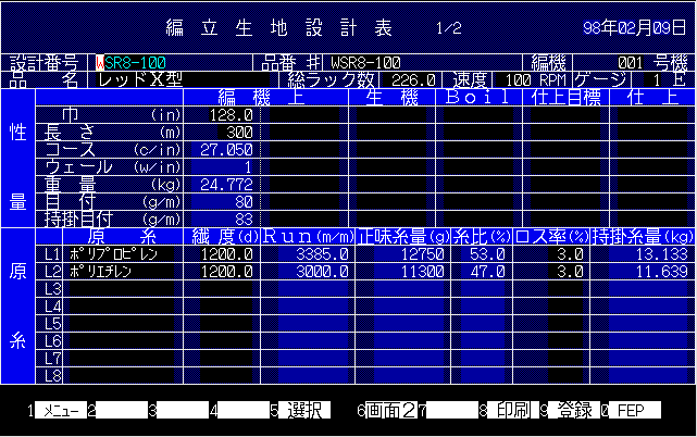 F1メニューに戻ります。 F5選択画面を表示します。 F6編み立て設計画面2を表示します。 F8編立生地設計表を印刷します。 F9編立設計をパソコンに保存します。 F10漢字変換NECAIを使用しているときに漢字変換モードに切り替えます。