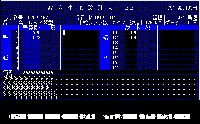 F1メニューに戻ります。 F5選択画面を表示します。 F6編み立て設計画面1を表示します。 F8編立生地設計表を印刷します。 F9編立設計をパソコンに保存します。 F10漢字変換NECAIを使用しているときに漢字変換モードに切り替えます。